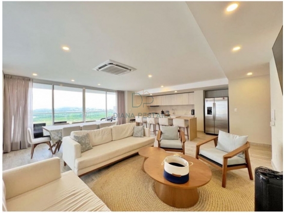 DISTRIBUCION: Sala - comedor, cocina con mesón en isla y dotada de campana, estufa y horno, gabinetes superiores e inferiores y sala con acceso al amplio balcón, donde podras encontrar un cómodo jacuzzi. Ademas contamos con 2 habitacion principal con closet y baño privado con salida directa al balcon, 1 habitacion adicional con closet y salida al balcon, estudio, baño social o compartido para las habitaciones, zona de labores y parqueadero.